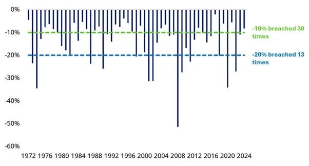 Taking world stock markets (as represented by the MSCI World Index) 10% falls happened in 30 of the 53 calendar years prior to 2025. In the past decade, this includes 2015, 2016, 2018, 2020, 2022 and 2023.