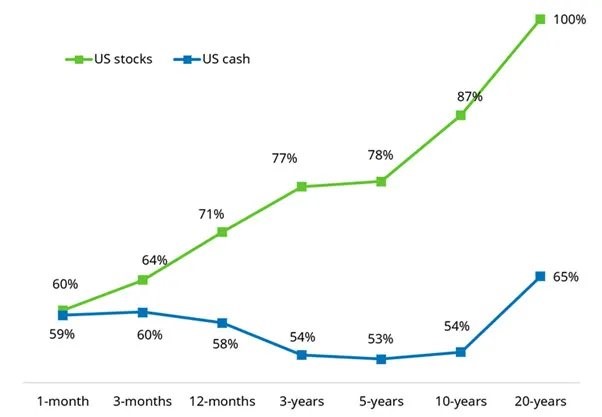 Percentage of time periods where US stocks and cash have beaten inflation 1926-2024