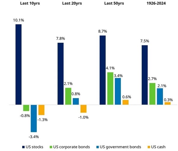 Source: Stocks represented by Ibbotson® SBBI® US Large-Cap Stocks, Cash by Ibbotson® US (30-day) Treasury Bills. Data to December 2024. Morningstar Direct, accessed via CFA institute and Schroders.