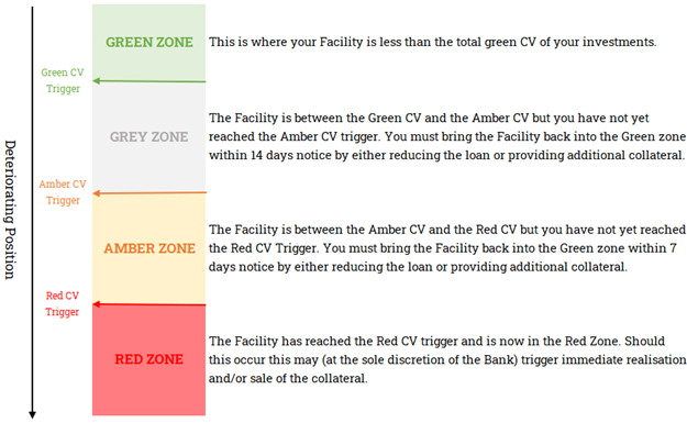 Your Facility should be fully covered by the CV of your liquid assets held with the Bank. Whether due to fall in market value of the assets causing the CV to reduce or the value of Facility increasing relative to the CV (e.g. if you borrow in a different currency than your investments), your Facility should be fully covered by the CV. The Bank will monitor this by applying Green, Amber and Red CV trigger points to your investments, which will determine the action that needs to be taken to ensure the loan is fully covered at all times, as explained below: