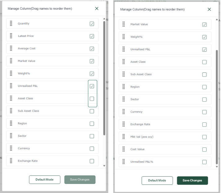 - By clicking and holding down on the grid icon on the left, you can move the options into your preferred order.